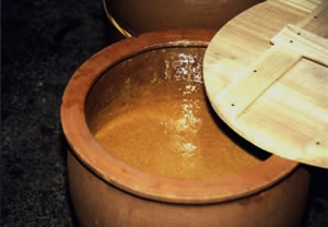 When cooled in the cooling pot, the juice thickens and becomes pasty. As it still contains much heat, it is moved into an unglazed pot called “Hiyashi-kame(cooling ceramic pot)” and left out for further cooling and crystalization. The above picture shows the juice being cooled in a “Hiyashi-kame”.