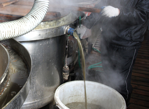 右写真はその「ふかし」を行っている所です。常に監視しうまくあくだけが外に溢れる様に蒸気量を調節します。