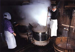 和三盆糖の炊き上げは釜場作業の中で最も重要であるにも関わらず、温度計も糖度計も一切使わず、 かき混ぜる竹棒からのしたたり具合と、あとは勘だけで上がりを判断します。 ここはこの様に職人技的要素が大きく、通常最も経験を積んだ者がその役にあたり「主炊き」と呼ばれます。 砂糖を絞る締め場から釜場までは一連の流れ作業になるので、「主炊き」はまた締め場の責任者と協議して、その日一日の作業全体をも取り仕切ります。 上記写真で、中央で釜を炊いているのが「主炊き」、左の女性が「中炊き」です。